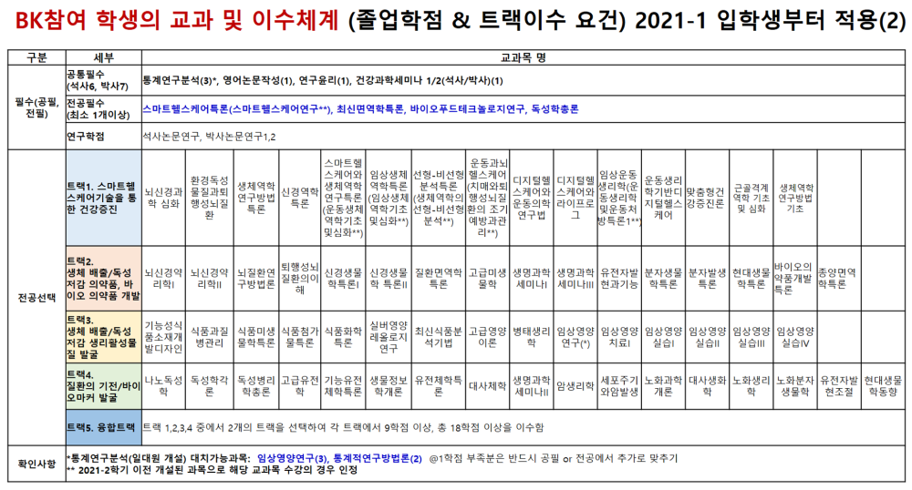 | 석박통합과정 (전공60학점이상) | BK석사요건 + 공통필수 1학점(건강과학세미나 2 이수), BK전선 18학점 이상 이수(트랙구분 없음) | |
